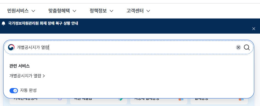 1. 정부24 메인화면에서 검색창에 ‘개별공시지가 열람’ 또는 ‘공동주택가격 열람’ 입력