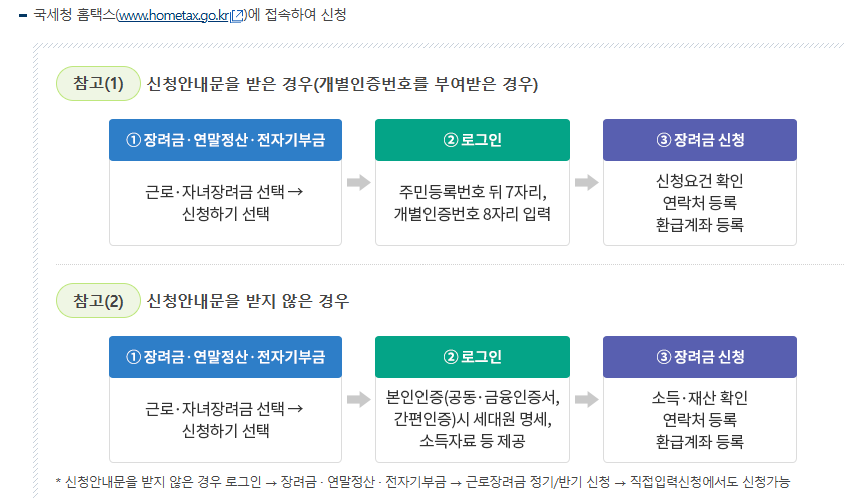 또한, 국세청은 매년 자격이 추정되는 가구에게 문자 또는 우편 안내문을 발송하기 때문에, 이를 받은 경우 자격 가능성이 높습니다.