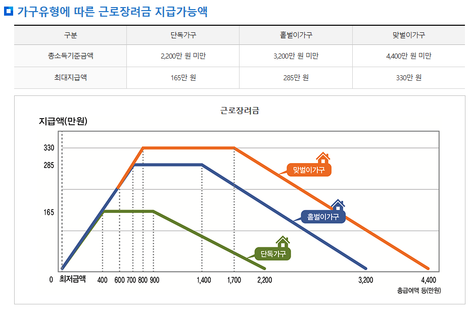 근로장려금은 가구 형태에 따라 지원 기준이 다르게 적용됩니다.