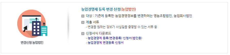 농업경영체 통합정보시스템 → 접속 → 공동인증서 로그인 후 ‘정보변경신청’ 메뉴 선택 → 변경사항 입력 후 서류 첨부 및 제출