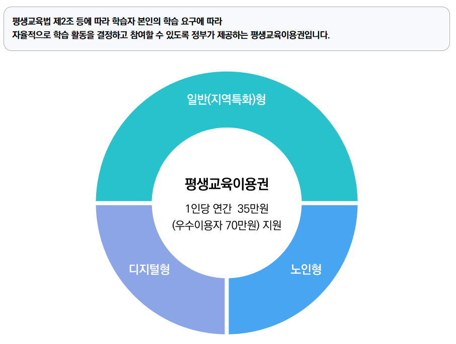 예를 들어, 자격증 취득, 외국어 학습, 컴퓨터 활용, 문화예술 강좌, 직업능력 개발 등 다양한 교육 과정을 선택할 수 있습니다. 학습이 특정 연령대나 직업군의 전유물이 아닌, 모든 국민이 누릴 수 있는 ‘권리’임을 실현하는 제도라고 할 수 있습니다.