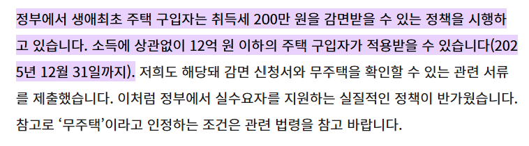 이처럼 취득 이후의 관리 사항까지 충족해야 면제 혜택이 온전히 유지되며, 정책 취지와 달리 투기 목적의 사용을 방지하기 위한 장치로 이해할 수 있습니다. 따라서 단순히 취득 시점만 고려하기보다, 향후 일정 기간의 거주 계획과 생활 여건까지 모두 고려하는 것이 안전합니다.
